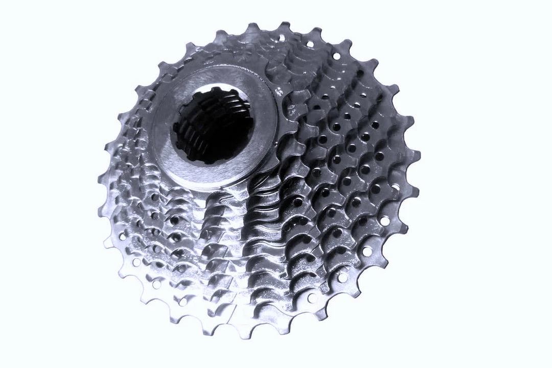 The Ambrosio 10-speed cassette fits onto a Shimano spline freehub body but is spaced for Campagnolo.