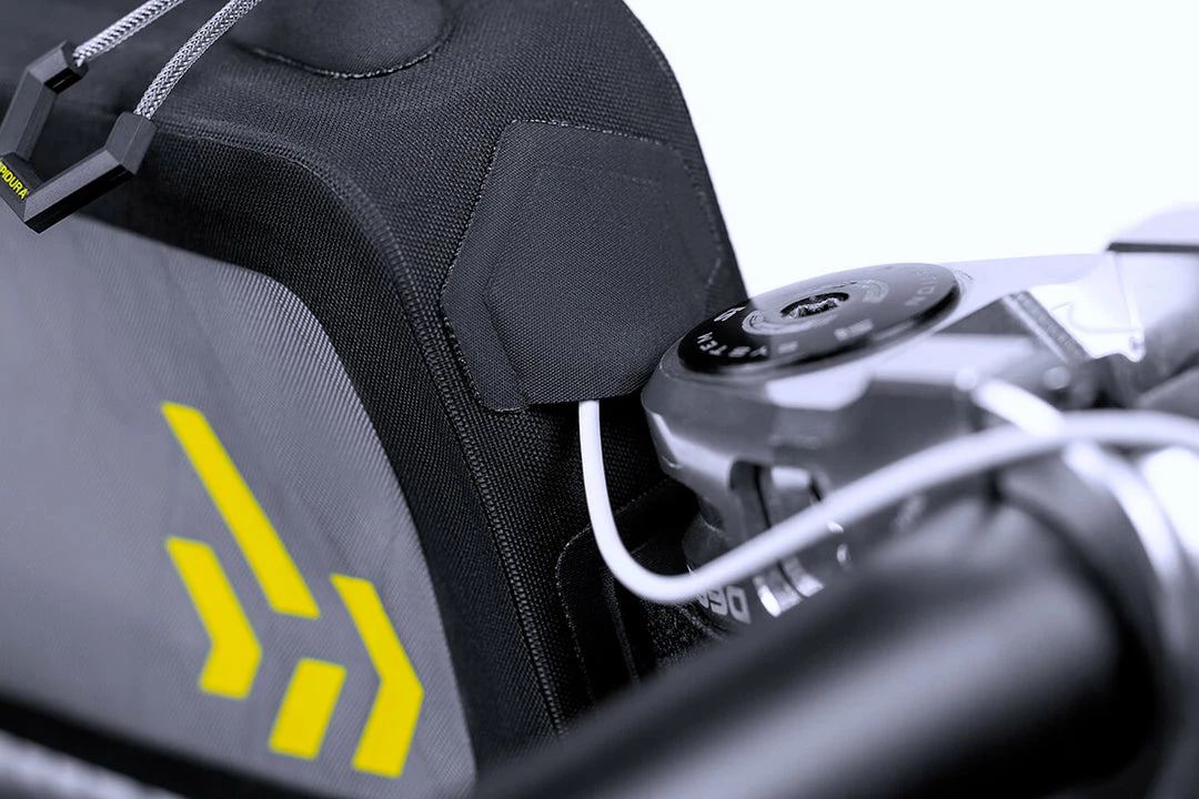 The long top tube bag also features a padded foam base to protect contents and a battery lead port for charging electronic devices on the go.