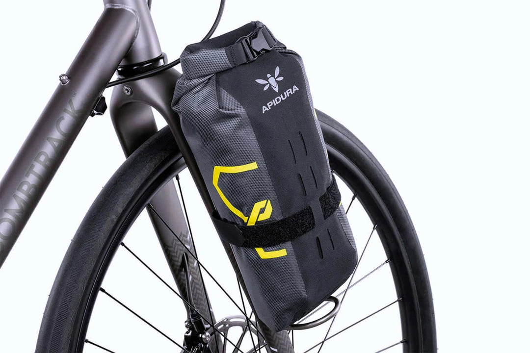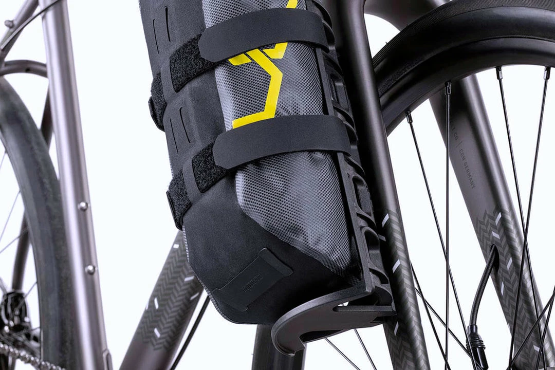 The Expedition Fork Pack is an ultralight waterproof storage space that attaches universally to any fork cage. It is designed for use on any bike with fork bolts, providing extra storage for adventures long and short. Ideal for storing compressible items such as sleeping gear and extra clothing, as well as bulkier items such as cooking gear or extra food and drinks, the 4.5L Pack is extremely adaptable.