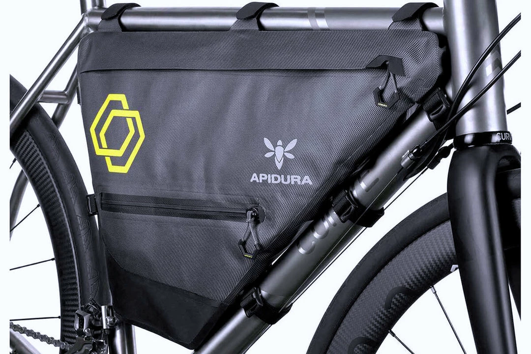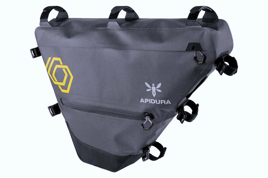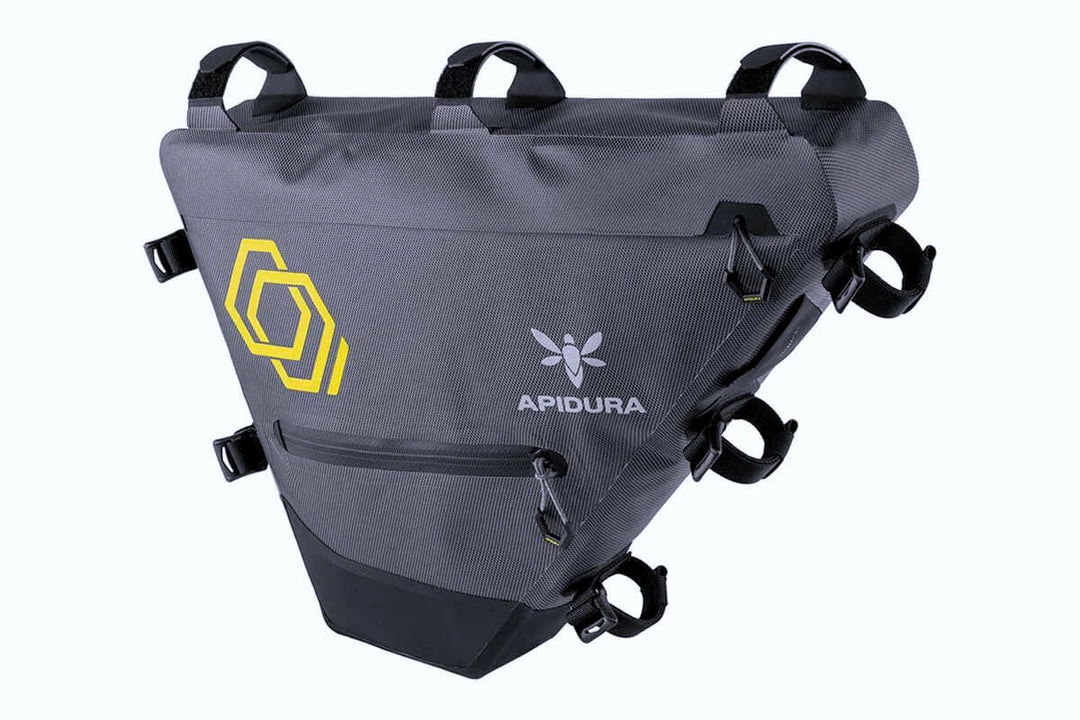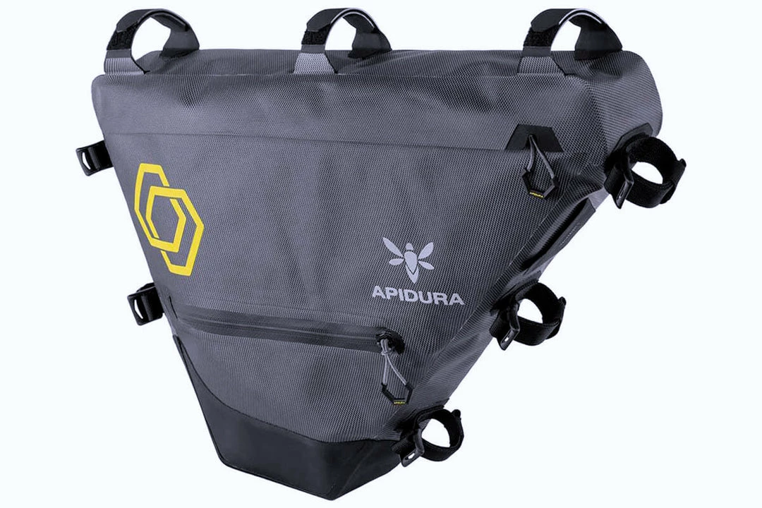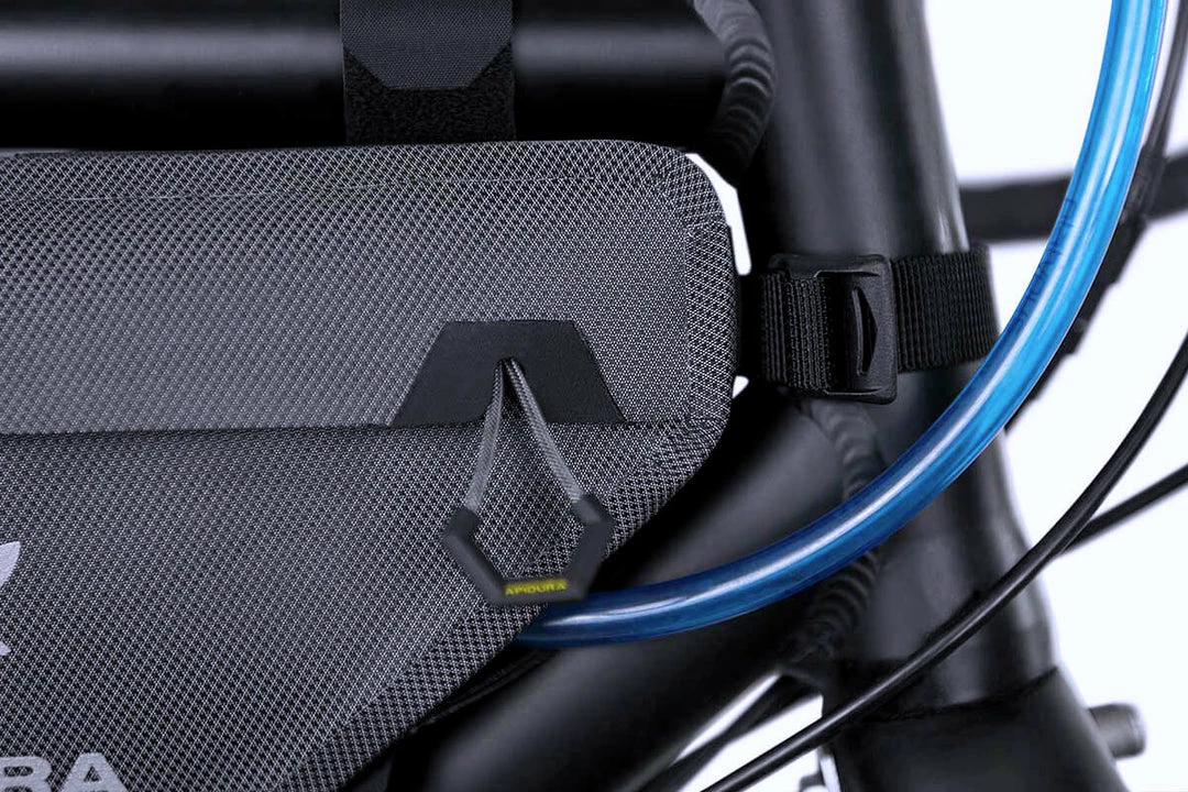 It’s constructed from a lightweight fabric, custom milled to Apidura’s specifications and able to be welded together at the seams to create a watertight seal. Zippers with protected closures ensure that kit stays dry, even in a sustained downpour. A battery lead/hydration hose port is handy for charging devices or staying hydrated on the road.