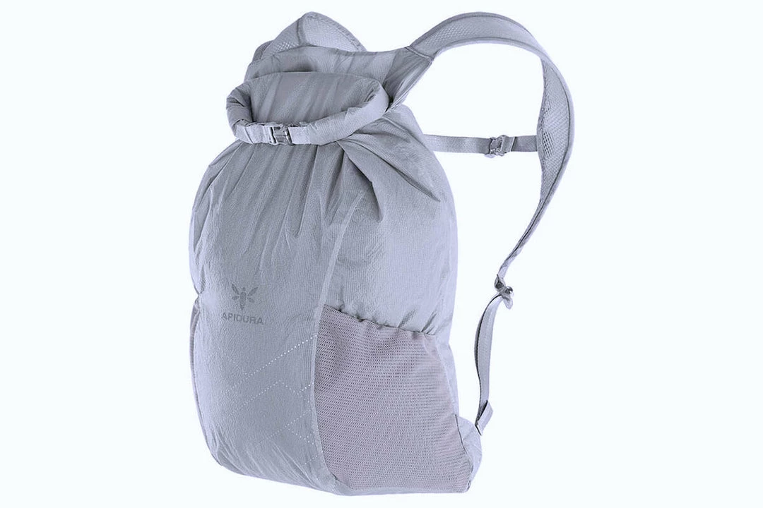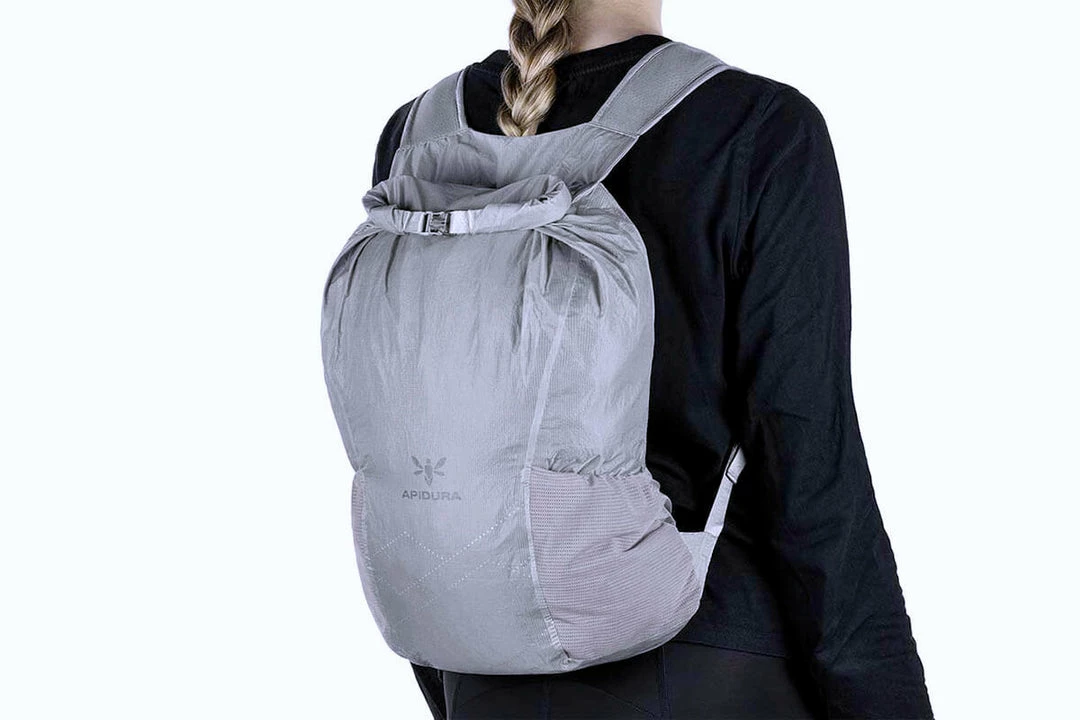 The Packable Backpack is waterproof, constructed from ultralight materials and features cycling-specific contoured shoulder straps for riding comfort. The integrated on-bike storage pocket attaches to the bike frame with an included velcro strap to keep the packable daypack out of the way when not in use.