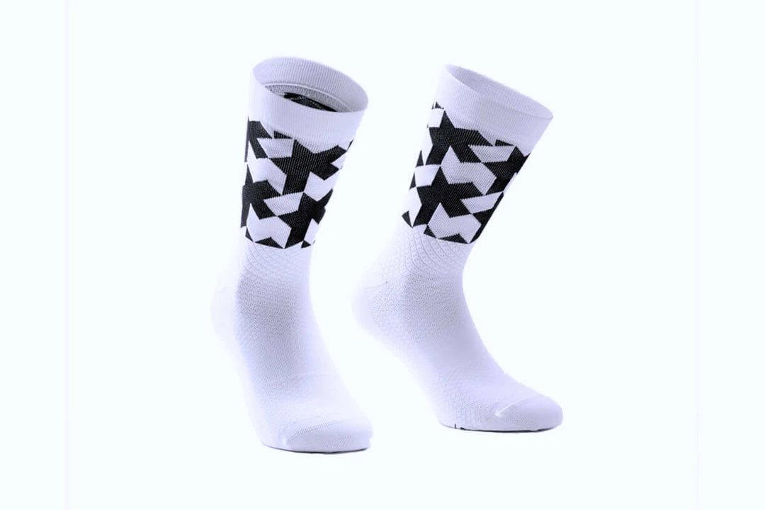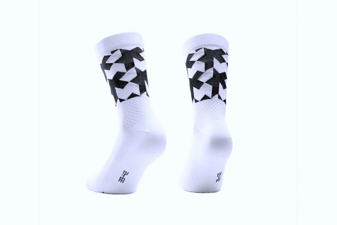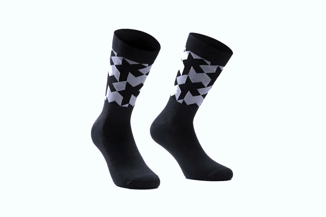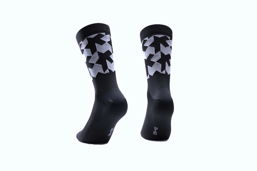 An ASSOS-favorite summer sock, returning with a longer 18cm cuff height, contrasting griffe graphic, and its proven breathable composition.