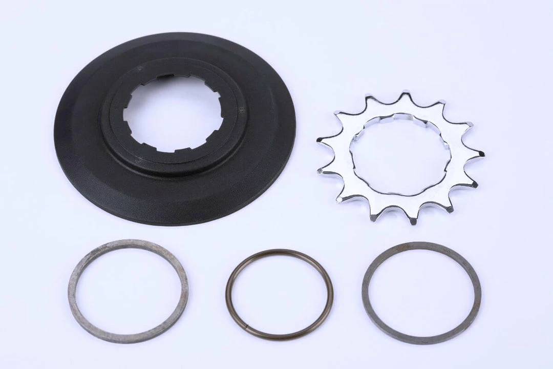 Genuine Brompton sprocket set including chain guide disc for BWR (Brompton Wide Ratio) hubs setup as a 3-speed (9-spline).