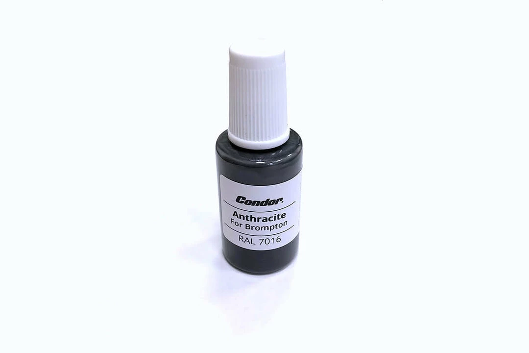 Condor Touch Up Paint for Brompton has been specially formulated for Brompton colours. Featuring an integrated brush, it is easy to repair chipped or scuffed paint. Our touch up paint can be applied without a primer and dries in 2 hours.