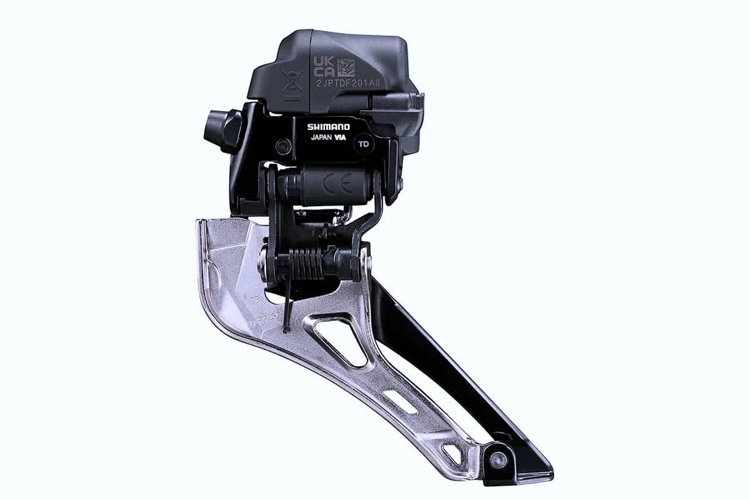Shimano’s new Di2 front derailleur’s operation is pioneering. Smooth shifting is guaranteed thanks to a microchip communication link with the gear levers. What’s more, shifting the rear derailleur automatically trims the front derailleur. The biggest difference you will notice is just how much quicker and effortlessly smoother shifting on the front chainrings is, even under load.