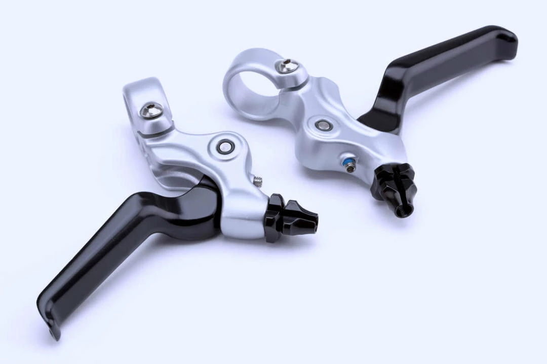 A pair of new style aluminium brake levers as introduced in 2017, with mounting holes for the new integrated bell and gear shifters.