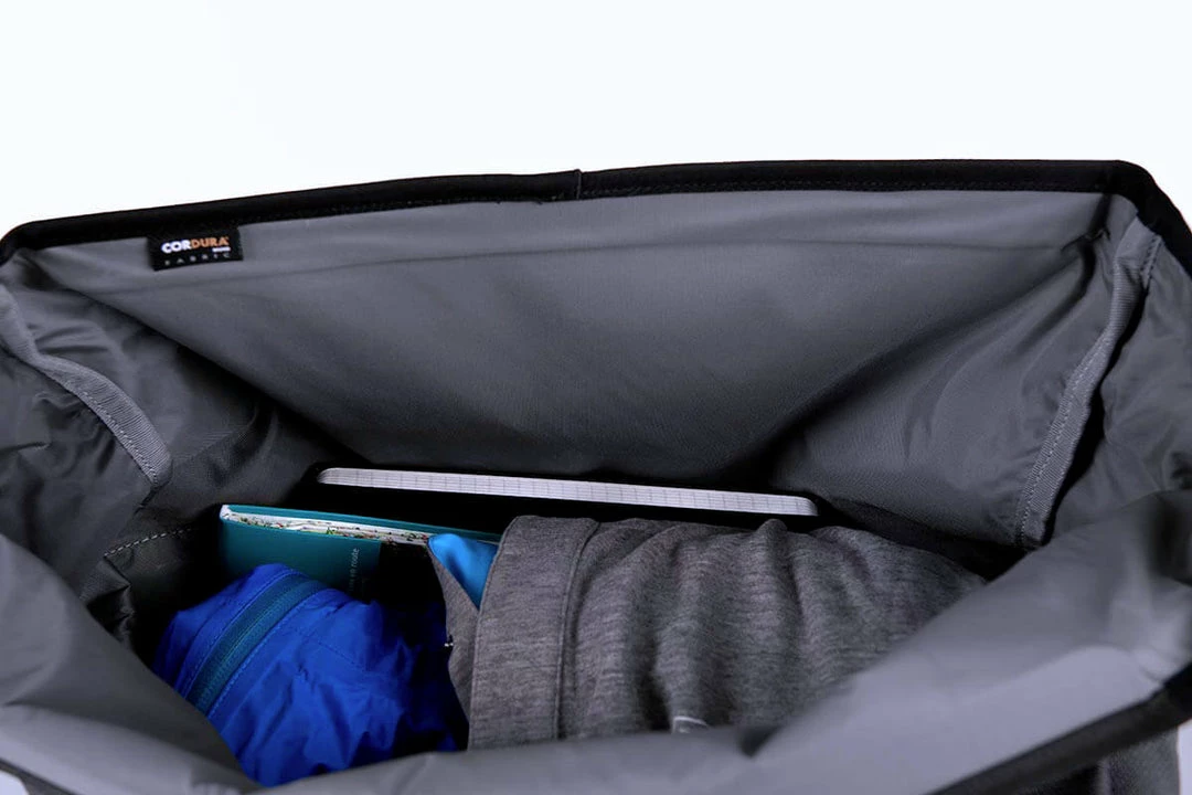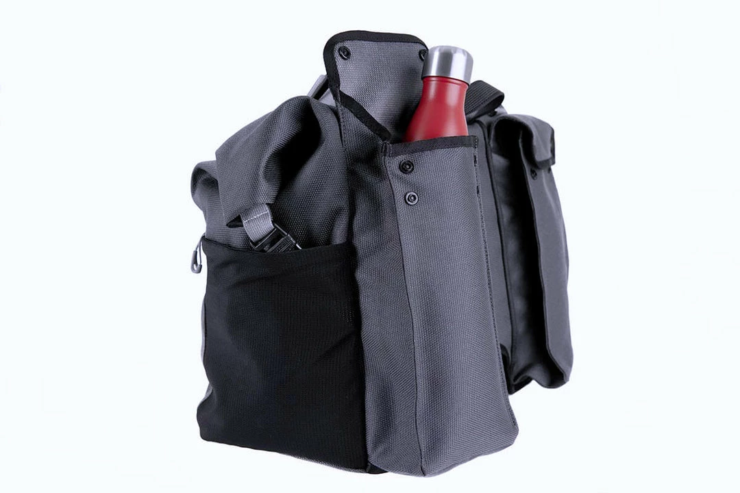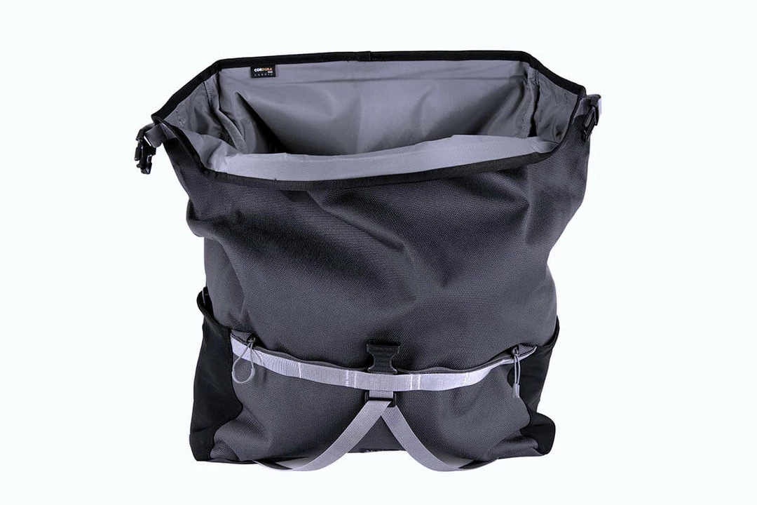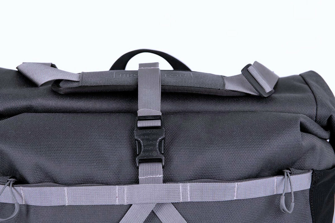 A fresh take on the T Bag, the Borough L Roll Top is made using Brompton’s exclusively developed 1000D Cordura Broken Twill fabric for superior durability and weather resistance. New features include an adjustable external load carry strap for easy access to helmets, jackets, or oversized items. There is large zipped pocket on the front for quick access to essential items, re-designed rear pockets with an integral water bottle sleeve, and a laptop sleeve.