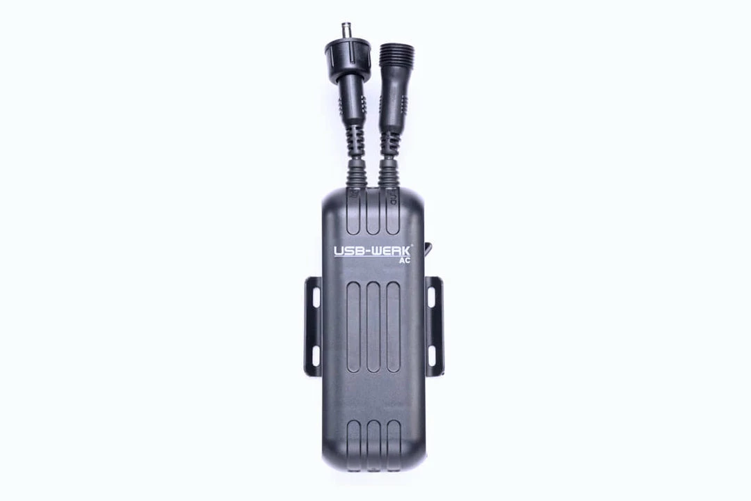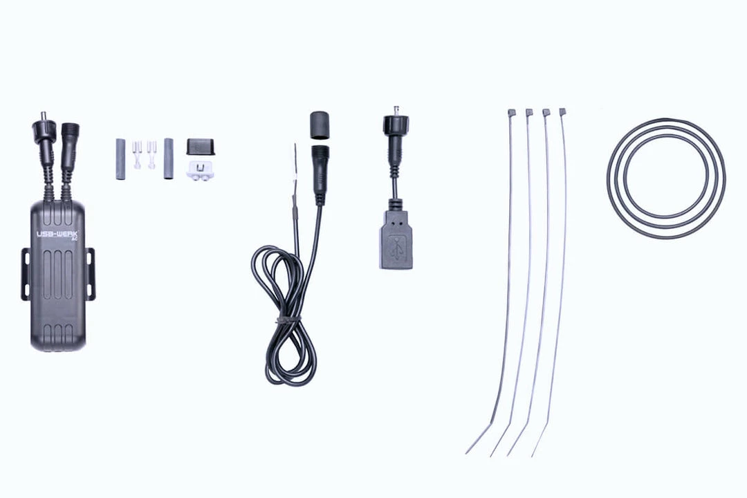 The USB-WERK supplies 5 V and up to 500mA current. An small integrated cache battery helps to provide a constant voltage supply at low speed or short stops. Includes standard USB-port adapter cable.