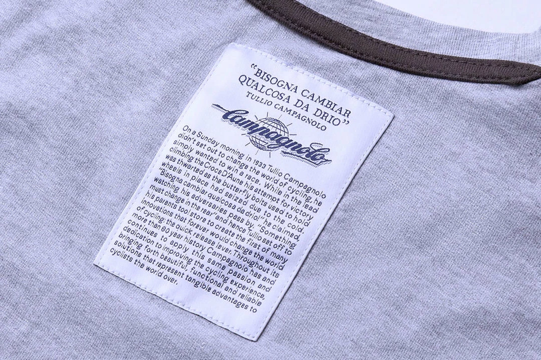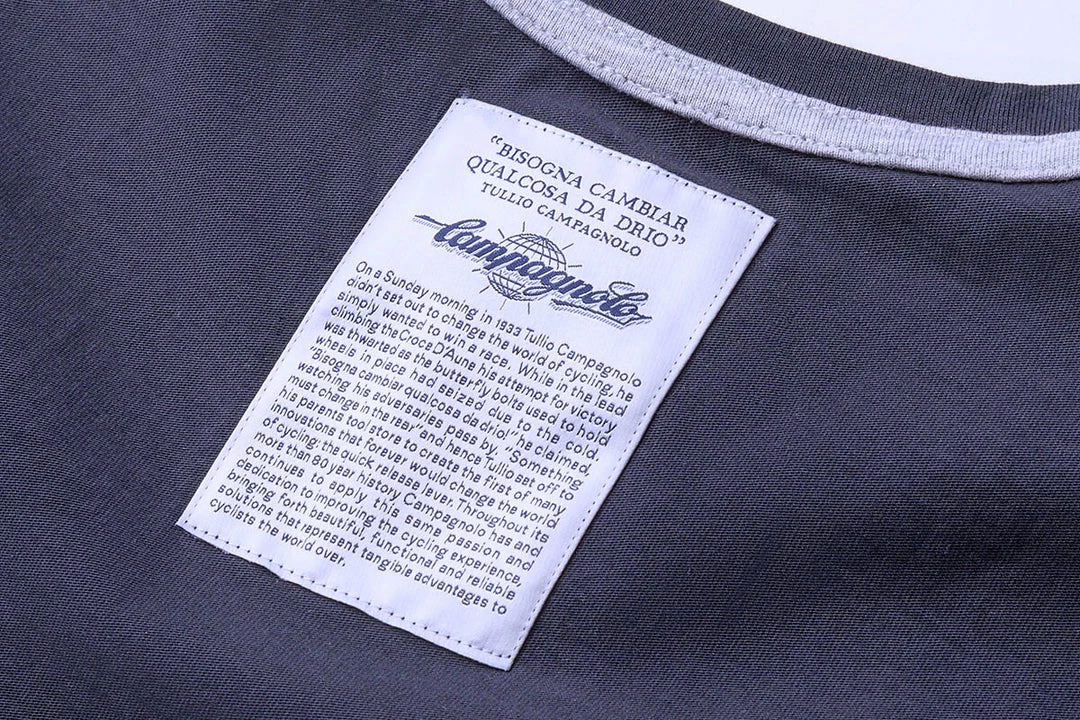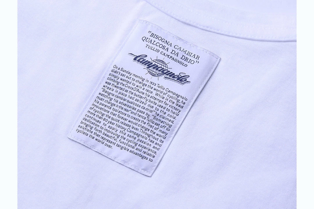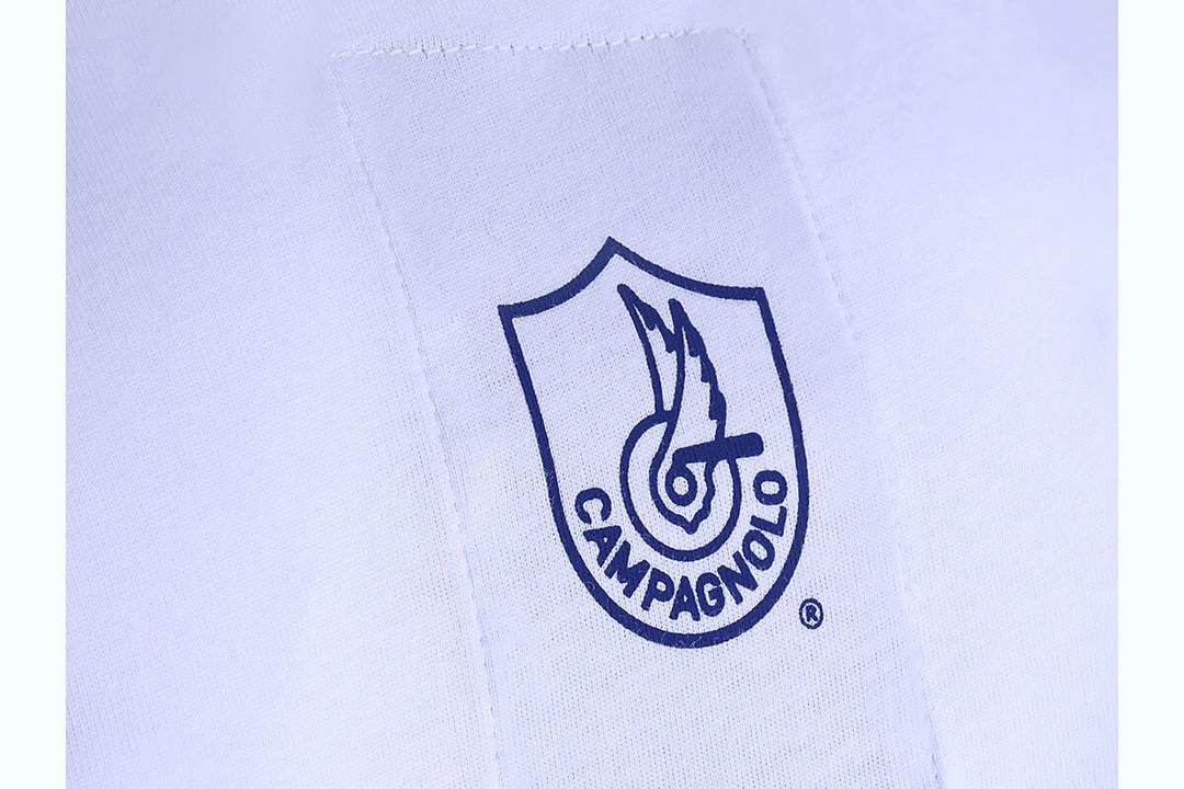 Designed and used by Campagnolo since the fifties, it was intended to represent a very important aspect of the company, its visionary approach to both the market with the world in the background and to innovation with the clear writing “brevetti”. The Brevetti Campagnolo T-shirt is made even more striking by the logos on the sleeve and back, the Campagnolo tag on the front stitching and the exclusive inside label that tells the story of how Tullio Campagnolo came up with the first quick-release.
