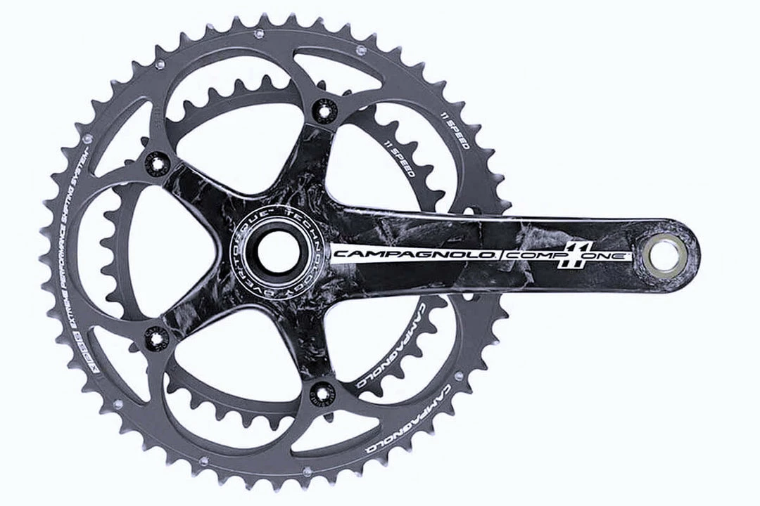 Campagnolo Comp One Chainset is a carbon chainset with Ove-Torque technology, which combine chainset and bottom bracket with wide stance bearings and a 30mm axle. This results in 5% increase in rigidity over the Campagnolo Record chainset. The chainset is also lighter than before. Campagnolo have also reviewed the profile of the chainring teeth to enhance efficiency and compatibility with the 11-Speed chain and the cleverly-shaped derailleur to contribute to making the movement of the chain extremely quick, even under load.
