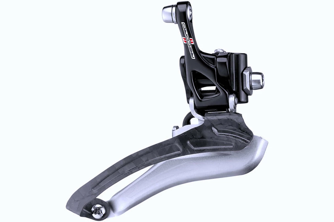 The most efficient downshifting on the market is achieved thanks to the integrated outer semi-cage in carbon fibre, a distinctive Campagnolo feature on the Super Record and Record front mechs, or by the positioning of a plate on the tip of the Chorus front mech.