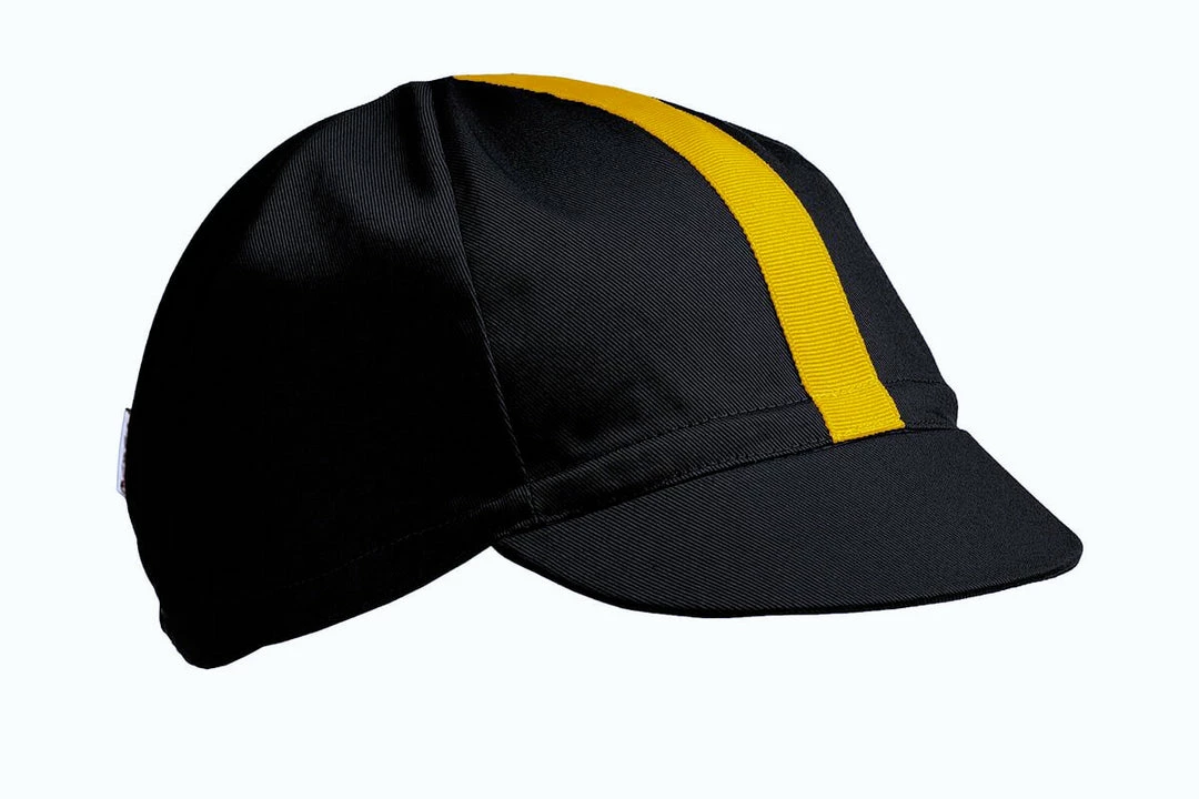 A traditional 4-panel cap made with a organic 7 oz cotton twill. Made in America, each cap features a coloured ribbon embroidered from front to back.