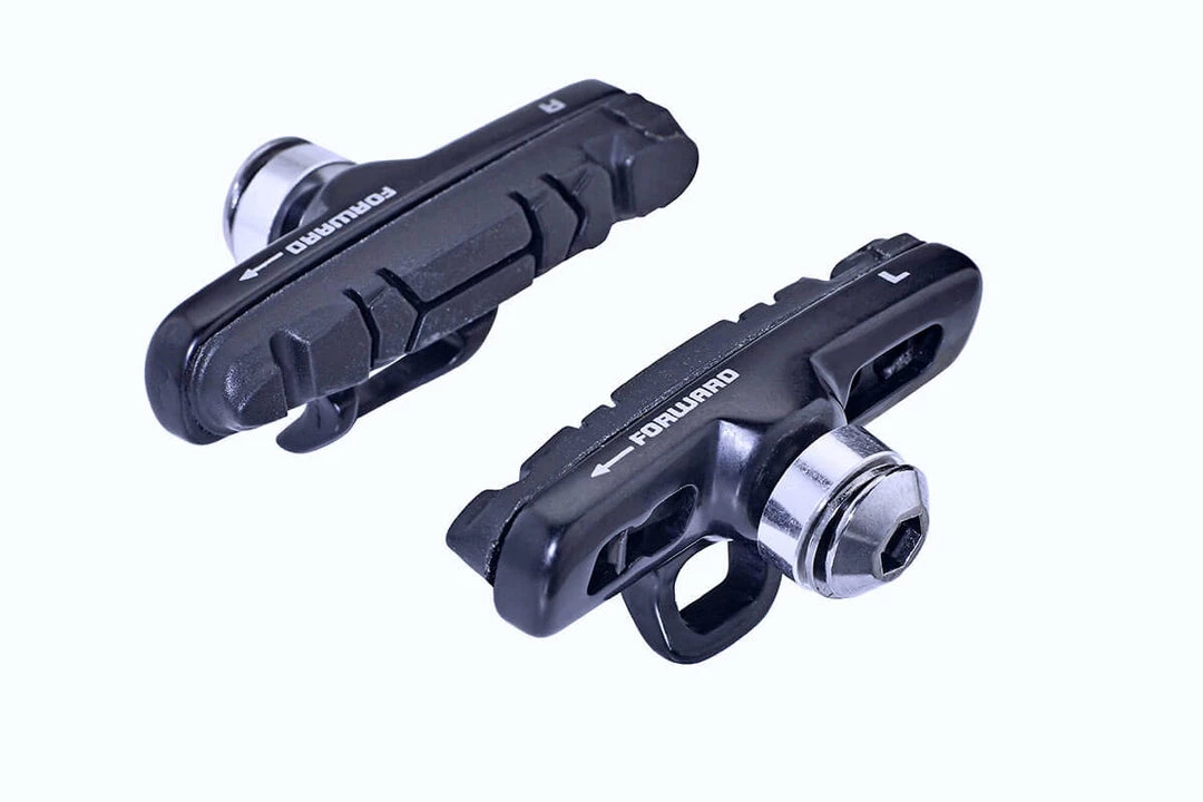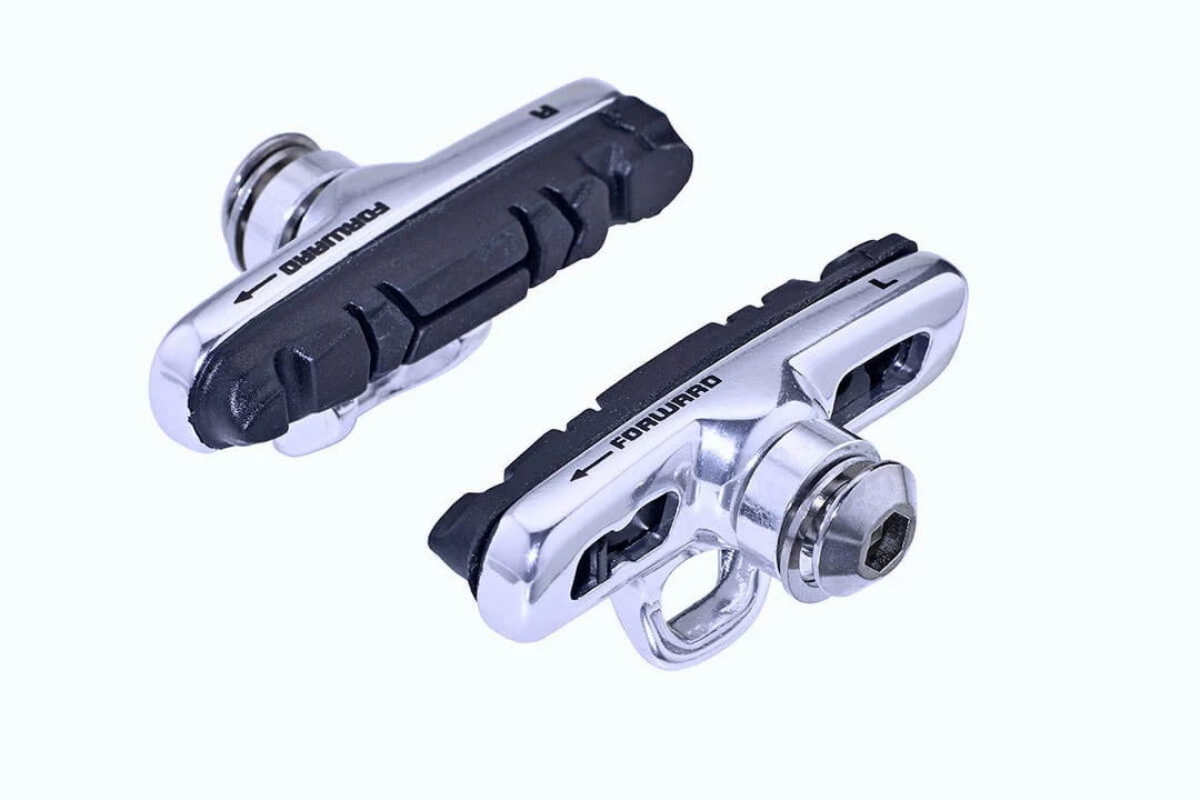 Replacement road brake shoes with quality rubber pad. The shoe set feature two shoes for use with a front or rear brake. The silver or black shoes can be used with Campagnolo Skeleton brakes.