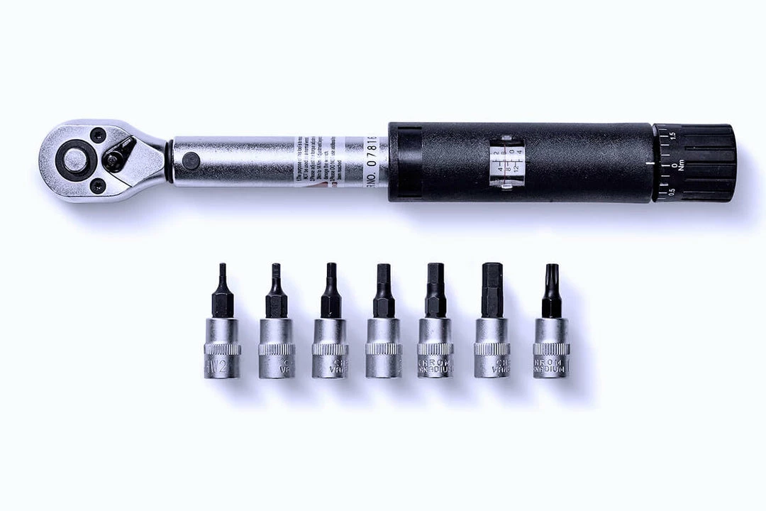 You can guess how tight to make all your bike’s bolt or use our Condor Torque Wrench and be sure. Set the desired torque on the handle, and this wrench makes an audible click when you reach the appropriate force. The Condor Torque tool has seven precision heads and a torque range from 3-15 Nm (20-240 inch-lbs) with a four-percent margin of error. The tool includes a hard-shell carrying case too.