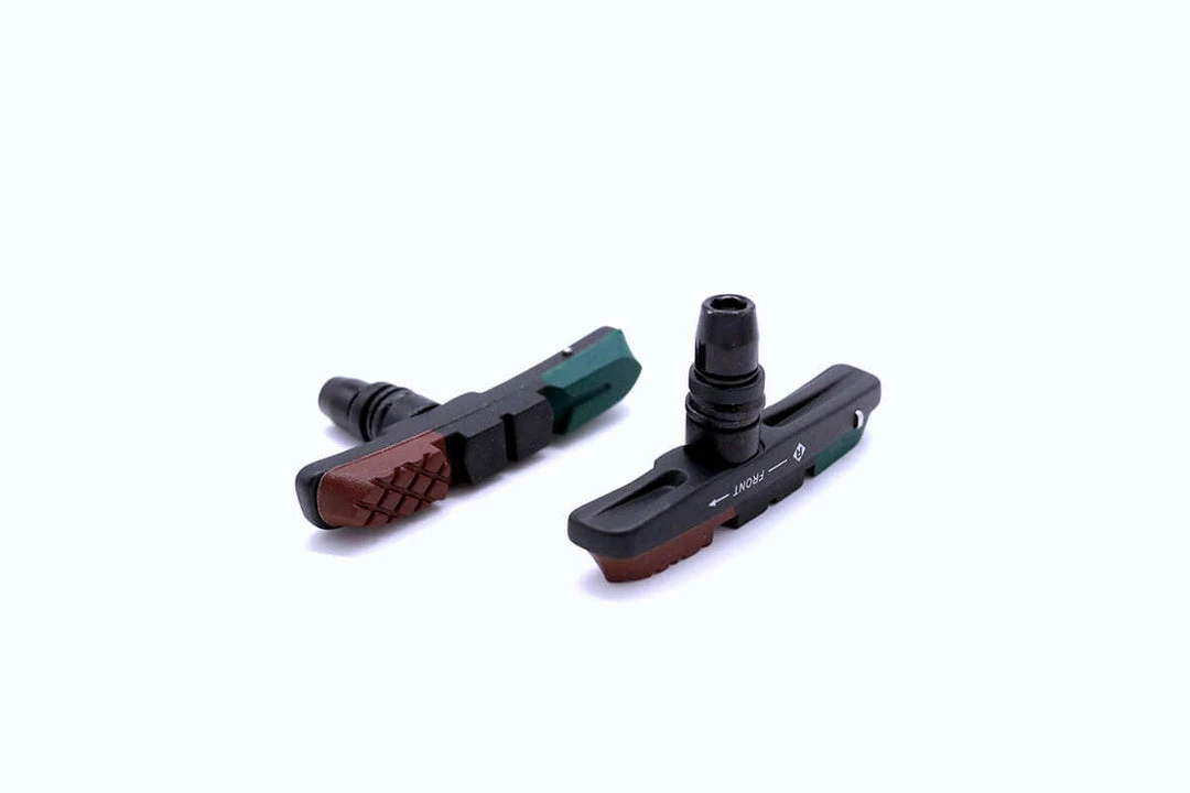 A set of high quality V-brake shoes and pads with specially formulated triple-contour compound design to improve braking performance in a variety of conditions.