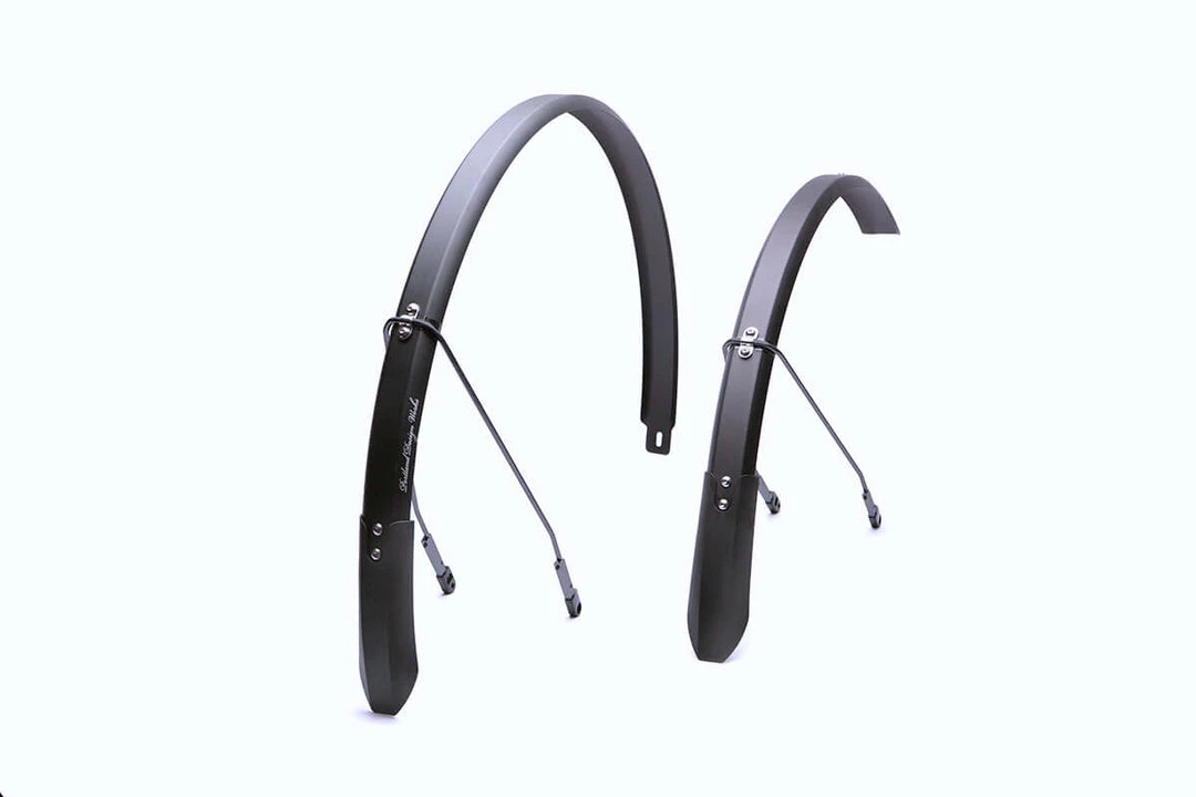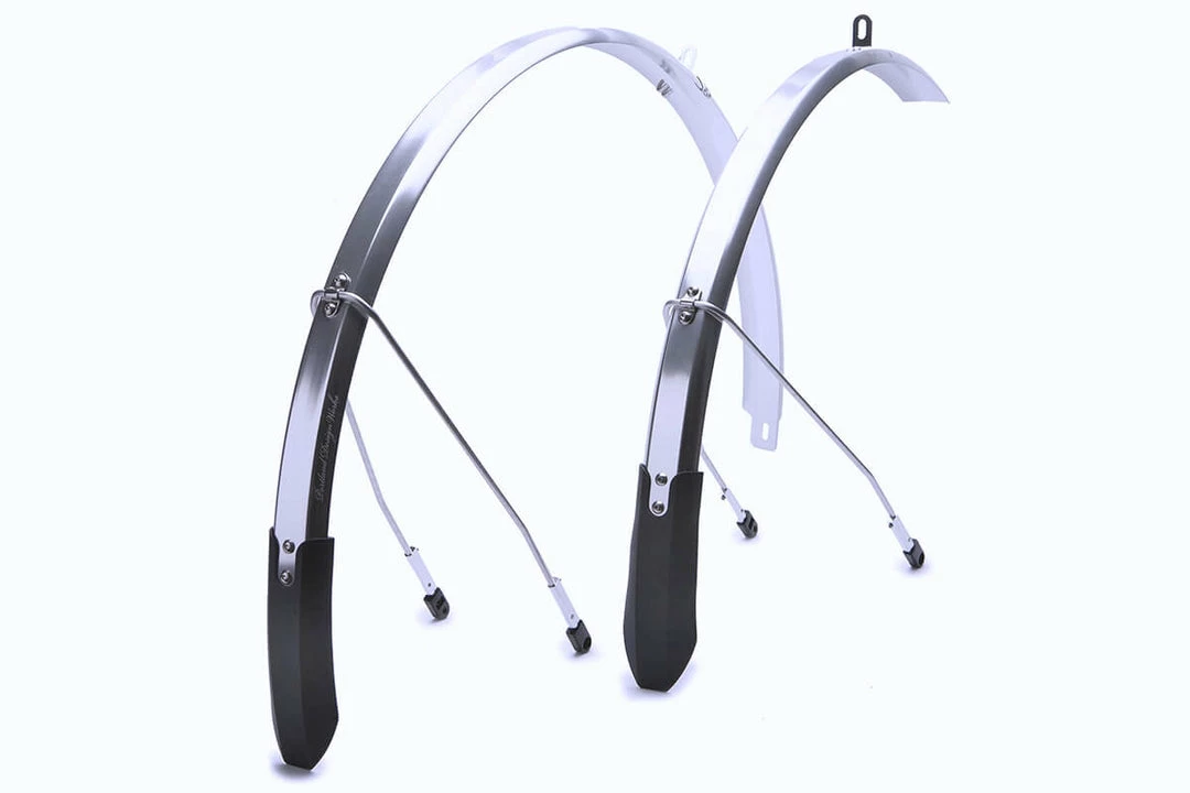 Made of anodized aluminum and adorned with laser graphics and an embossed alloy head badge, the Full Metal Fenders are a beautiful complement to any bike. They provide full-wrap coverage, even shielding your shoes and riders on your rear wheel thanks to sturdy rubber mudflaps. Safety release tabs ensure your wheels keep turning even if debris gets lodged between the fender and tyre.