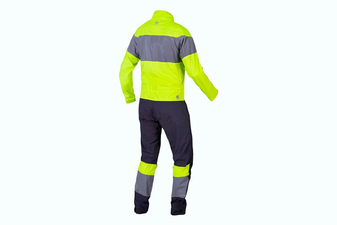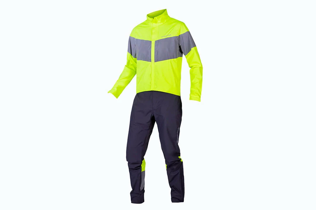 Endura exclusive split front design for maximum spray protection and comfortable on bike fit .