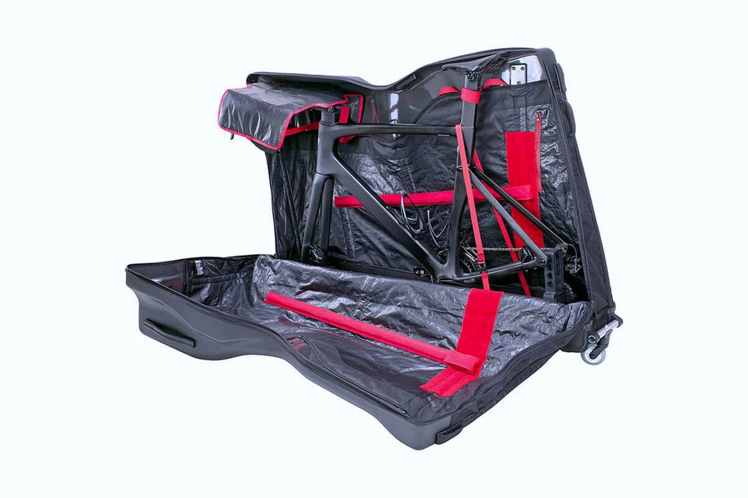 Revolutionary hybrid road and triathlon bike travel bag for very safe and convenient bike transportation.
