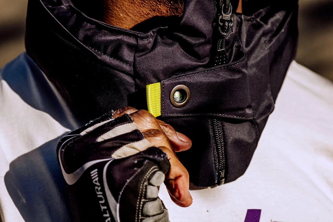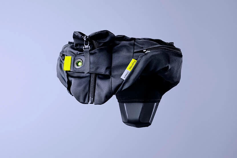 The cover that encloses the airbag is made of a black, waterproof and dirt-repellent functional fabric. The front zipper makes Hovding easy to take on and off. Activation is simple using the front tab. Hovding comes with a black cover in a durable functional fabric that protects the collar against dirt and wear.