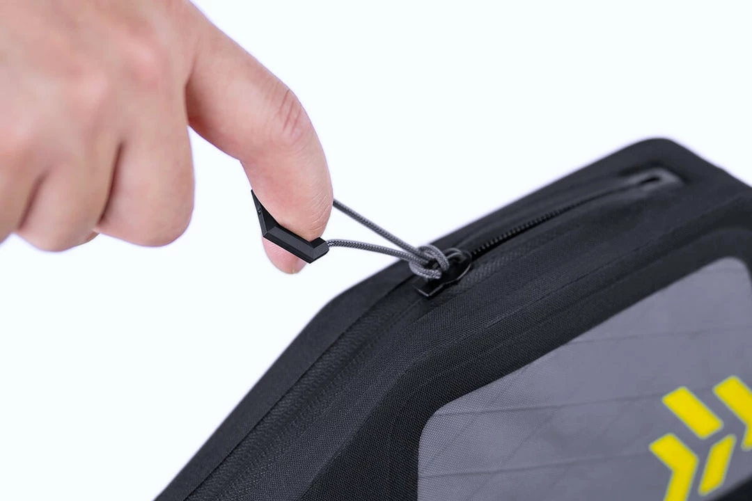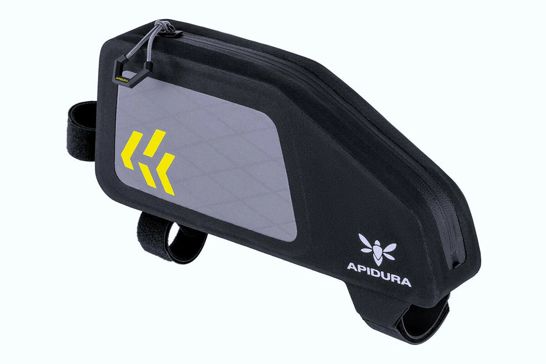 The mountain bike top tube bag is ideal for stashing snacks, light valuables and electronic devices. It securely attaches to the top tube with Hypalon-reinforced velcro straps that minimise abrasion on the frame. A one-finger zipper puller allows easy access on the move, while the full-length fully waterproof zipper safeguards contents against water and dirt when closed.