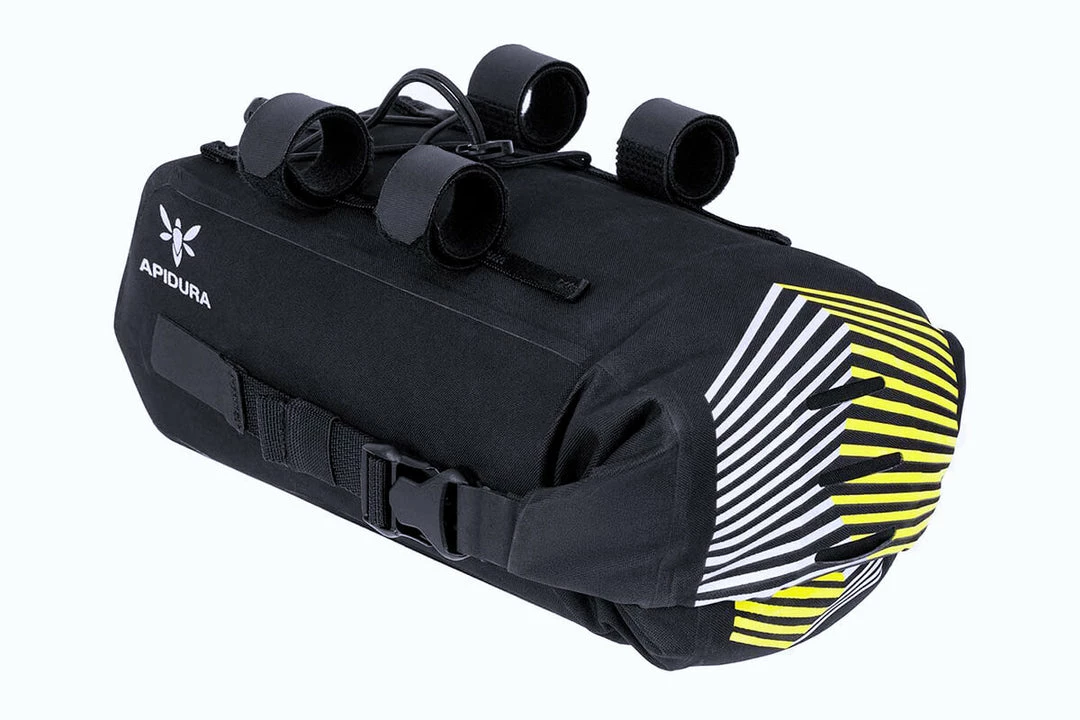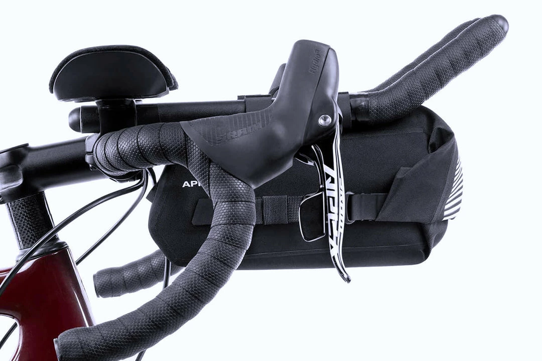 A customisable attachment system ensures this pack is compatible with all bikepacking aero bars and an adjustable bungee tie down creates additional space between the aero bars for items that require quick access. The roll down closure provides flexible carrying capacity while minimising the aero bar bag’s front profile and maintaining its slim design.
