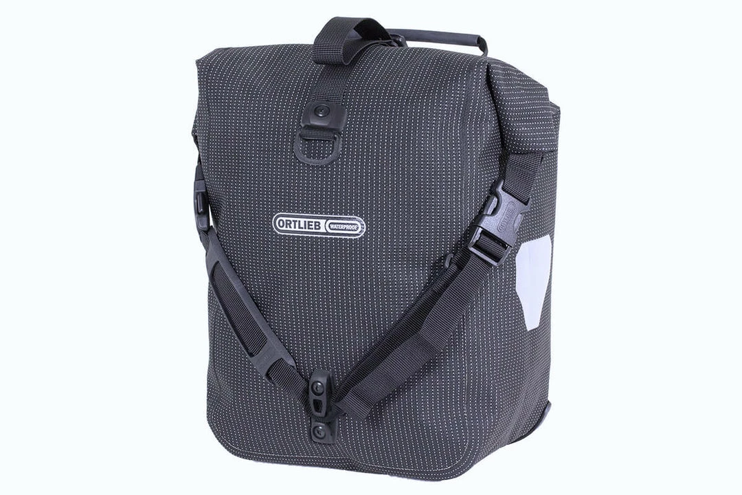 High visibility is so important to us at ORTLIEB because it is a matter of safety. Both the waterproof, polyurethane-coated Cordura fabric in neon yellow and the black fabric parts of this bag are densely interwoven with high-luminosity reflective yarn. This composition turns the entire bag into an eminently visible reflector when it is picked up in the headlights of passing cars.
