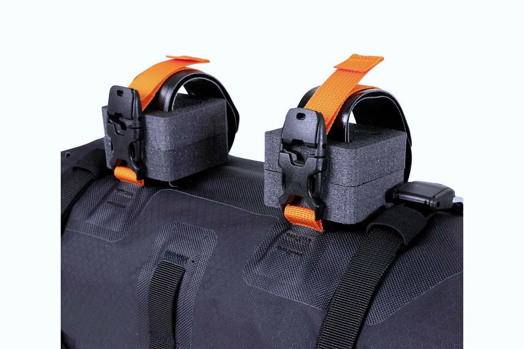 Compression belts on the outside enable the stowing and attachment of additional equipment. Moreover, the Handlebar-Pack comes with four hooks to enable the attachment of an ORTLIEB Accessory-Pack for additional stowage space. Consisting of spacers and two strong Velcro straps, the mounting system ensures secure attachment to any handlebar type, including carbon handlebars. The pack’s stiffened interior and head-tube attachment offer additional stability – in any terrain.