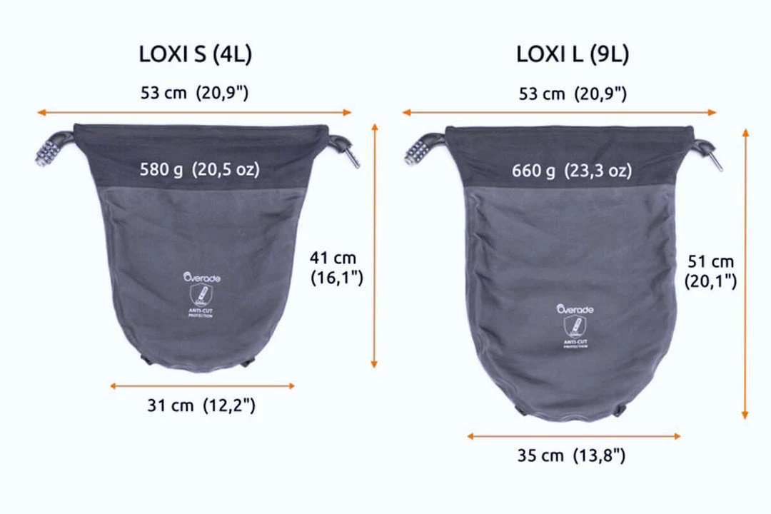 LOXI L capacity is 9 litres. You can store inside any bike helmet, gloves, lights, a raincoat, a safety vest. LOXI S capacity is 4 litres. It can be used to store smaller accessories like Plixi, our foldable bike helmet.