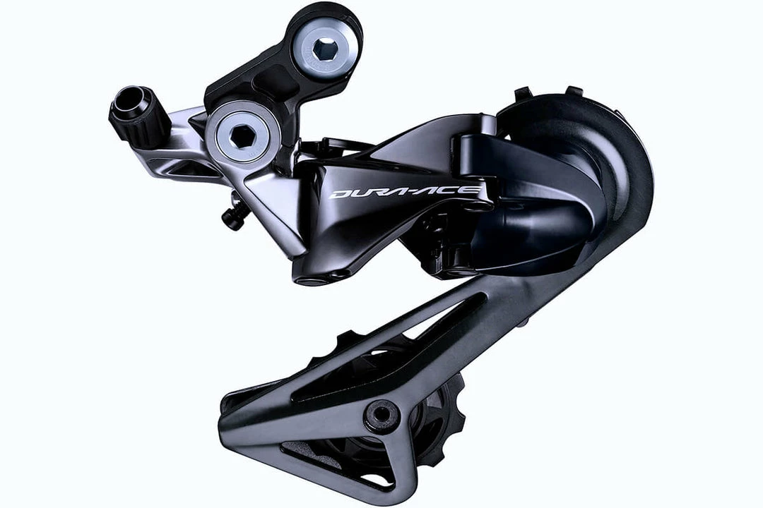 Dura-Ace rear derailleur with lightweight carbon cage and wide link design gives quick accurate shifts, and unmatched drivetrain efficiency.