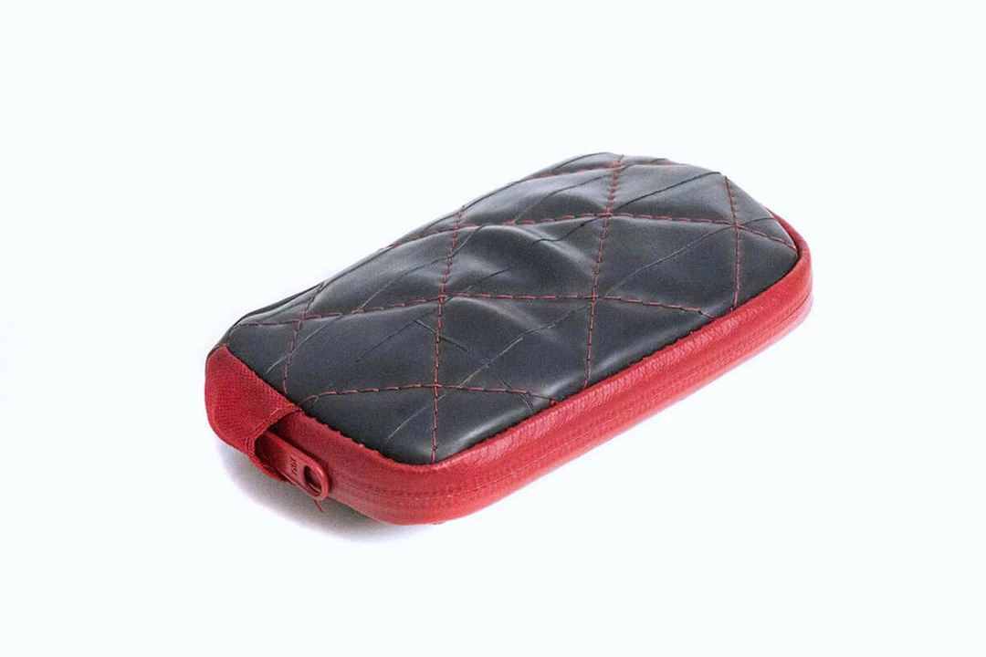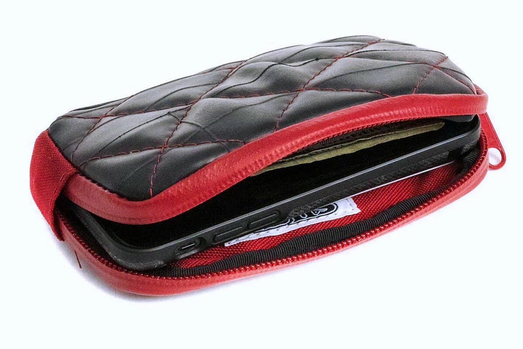 The recycled inner tube and neoprene construction along with the YKK AquaGuard zip will protect the contents from the weather. The case has two internal pockets and the main compartment so valuables can be kept secure, and the neoprene layer will protect against knocks and bumps.
