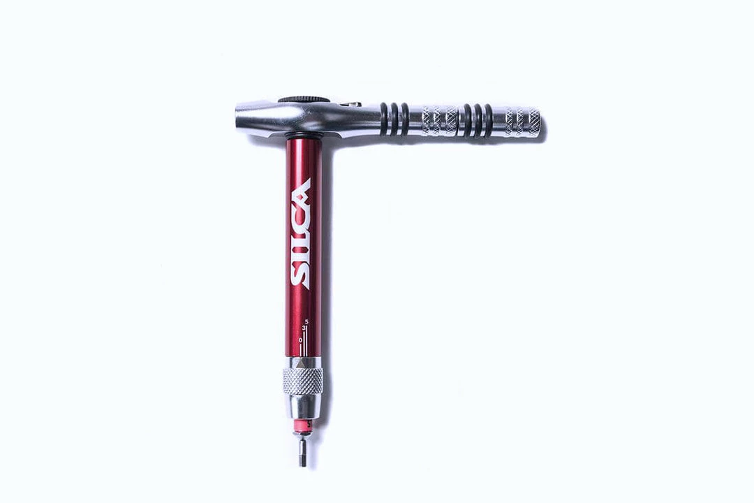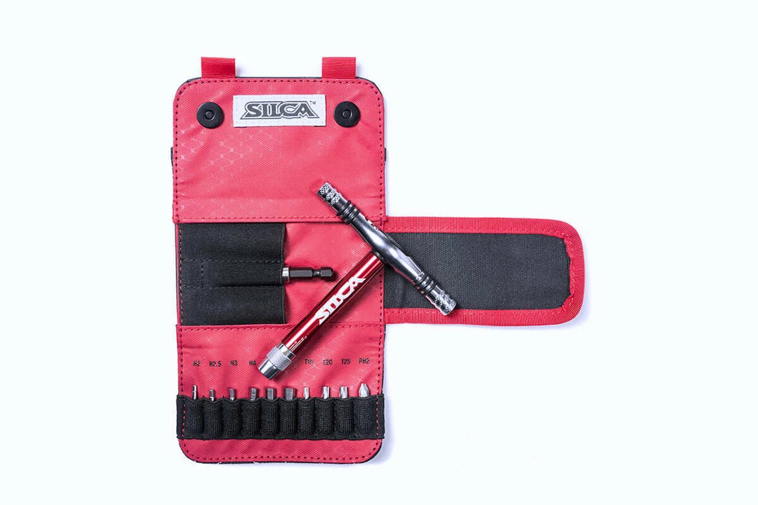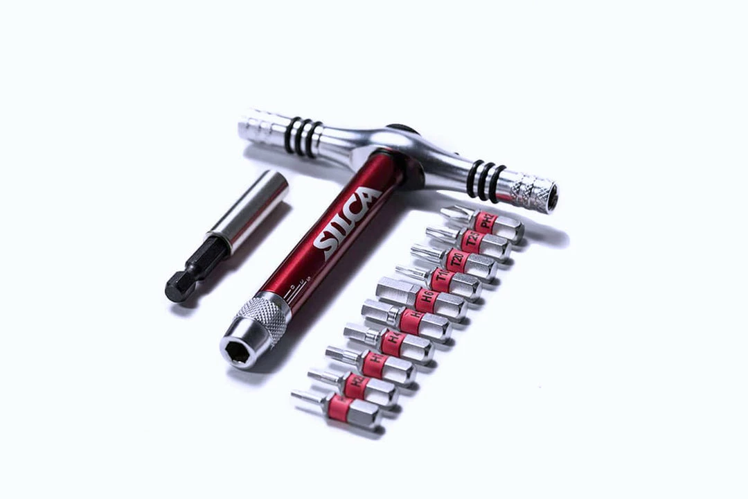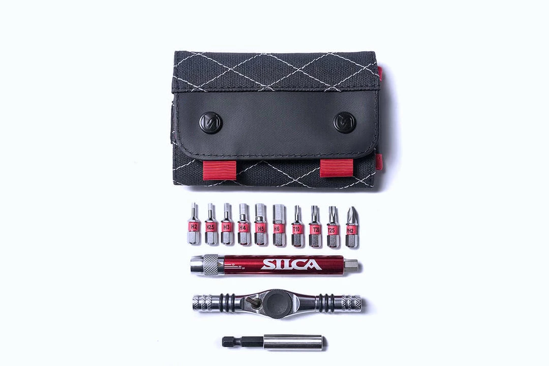 The T-Ratchet uses interchangeable magnetic components to convert from screwdriver to ratchet, to ratcheting T-Handle in seconds, which gives the user the ability to have several tools at once in an extremely small package. The tool, which includes the ratchet, an extender, Ti-Torque and bits sized H2, H2.5, H3, H4, H5, H6, T10, T20, T25 and Phillips H2; then breaks down into a trademark SILCA Duck waxed canvas carrying case measuring 120mm x 70mm x 30mm which means it will easily disappear into a jersey pocket.