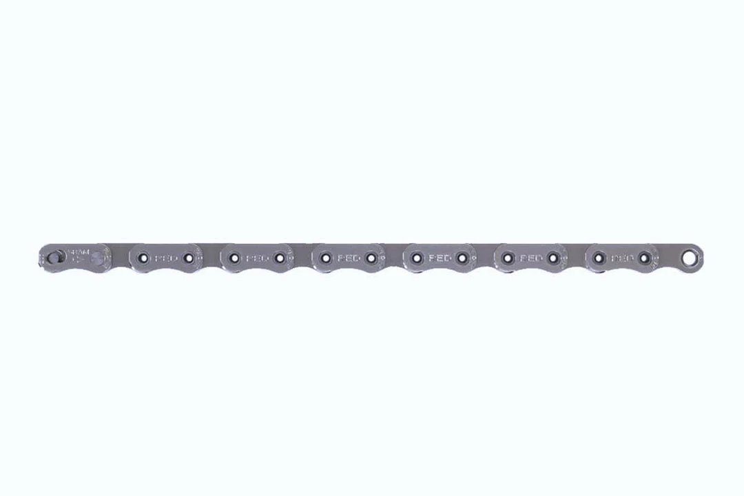 The all-new SRAM RED® chain was redeveloped from the ground up. The unique link shape allows the chain to be narrower and lighter while increasing strength and providing more space between the outer plates of the chain and the cogs on either side. Result: a quieter chain with faster, more precise shifts.