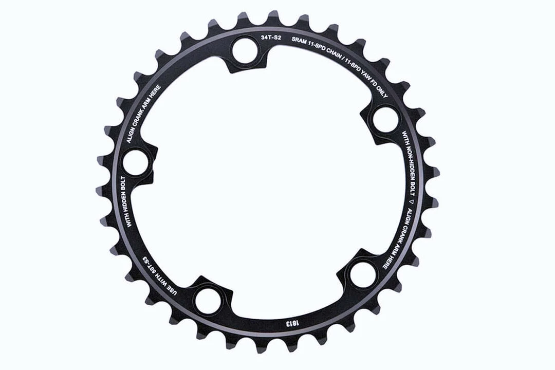 >Starting out with raw 7075-T6 alloy plate, SRAM stamp, coin, and CNC the rings to create a precise shifting whole. Coining shapes tooth profiles into designs CNC alone can’t match, creating a stronger tooth by strain-hardening the alloy for superior durability.