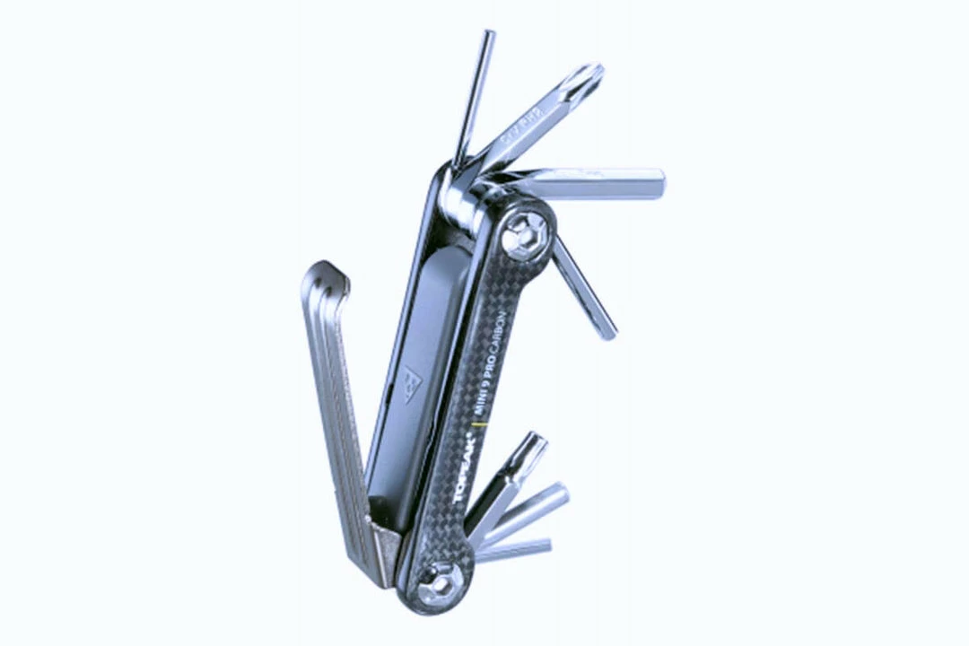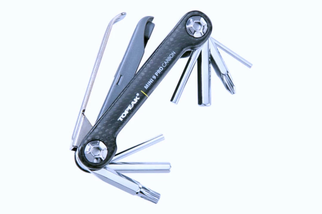 Ultra-light sleek carbon fibre version of the Mini 9 Pro. Professional quality folding tool offering hardened steel tools with 9 functions. Integrated and removable folding tyre lever stores inside tool body for a streamlined profile.